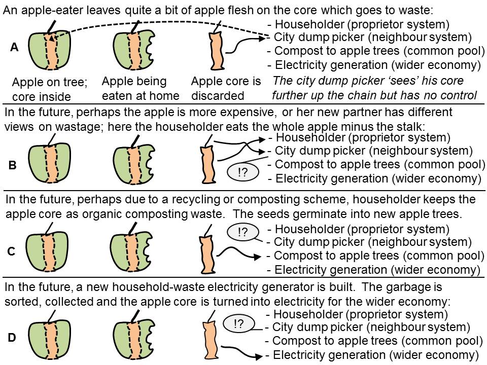 In the diagram below, the paracommons is exemplified by the passage of a to-be-more-conserved apple-core through the household to four destinations including the household. In the top of the diagram the apple core is discarded by the proprietor household and ordinarily goes to the city garbage where it might be picked over by people whose lives depended on households throwing away food and goods. For both the apple on a kitchen table and the apple core in the city dump there are two commons. The household members compete over the apple and the city dump ‘harvesters’ compete over who eats the apple core. However between these two positions are options that might or might not transpire. The household deciding to eat more food (case B) or recycle the apple in garden compost (case C) deprives the waste pickers at the garbage dump of their sustenance. The waste picker fears the outcomes of a household drive to be more efficient and ‘green’. Alternatively, a waste furnace needs waste to generate electricity depriving the householder, the waste picker and the compost of ‘their’ core.